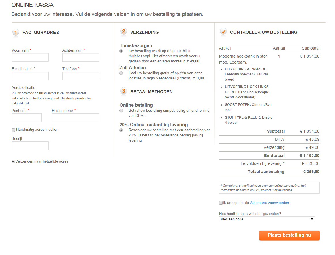 - De ondernemer wilde online meubels aanbieden. Hierdoor zou het gemiddelde orderbedrag wel wat aan de hoge kant liggen voor een online betaling op een webshop, wat mogelijk een drempel zou opwerpen bij online klanten. Hier wilden we een oplossing voor vinden.